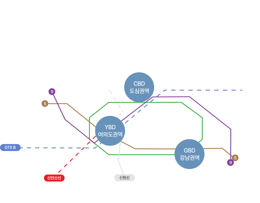 여의도역은 9호선, 5호선 지하철, 신림선 경전철과 GTX B, 신안산선, 서부선(예정) 등